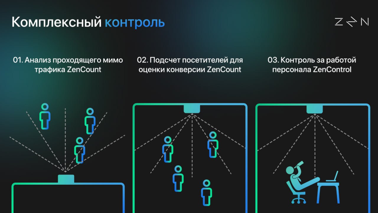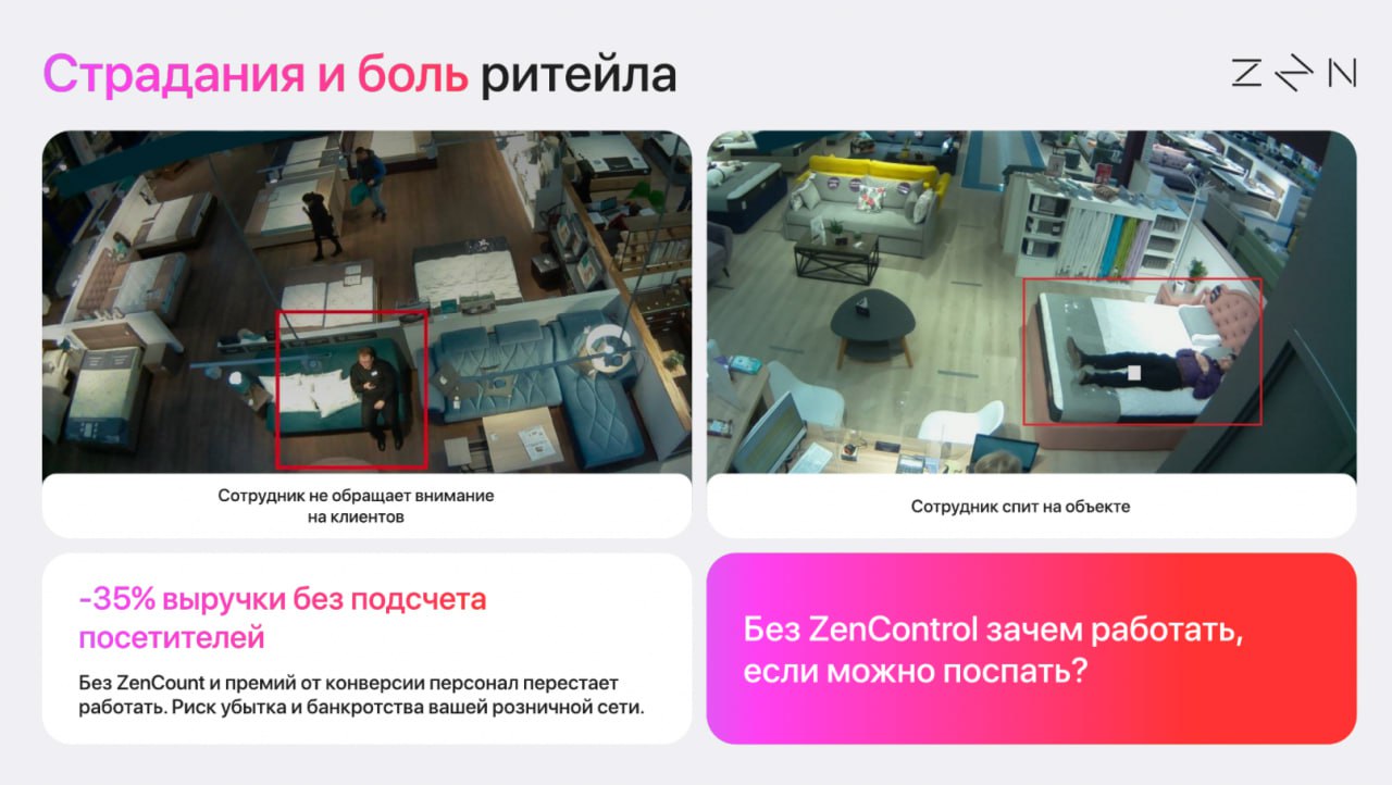 Zen. Проблема понятна: сотрудники магазинов игнорируют клиентов, спят на работе и так далее. Даже есть цифра -35% выручки. Не совсем понятно, как это посчитано, и почему до сих пор все компании, которые не пользуются Zen, не обанкротились. Но это уже вопросы для обсуждения. Решение указано на втором слайде — это система контроля за работой персонала с помощью искусственного интеллекта. В целом, довольно удачные слайды.