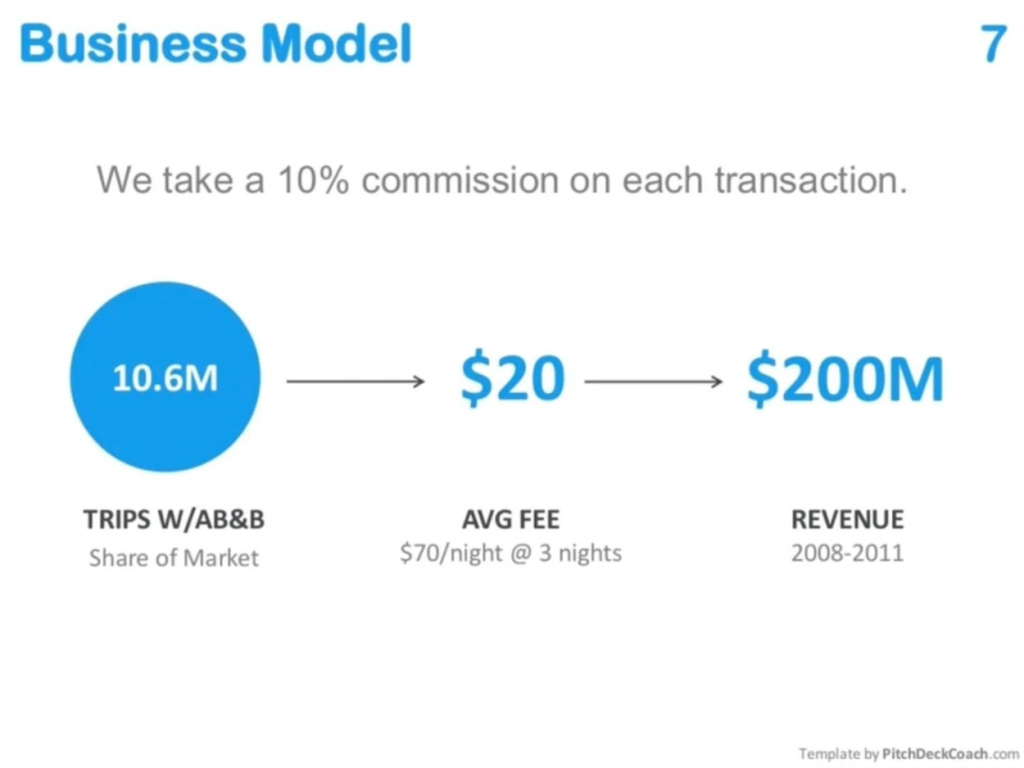 Это слайд AirBnB десятилетней давности. Здесь неочевидна структура затрат, но эти слайды делали тогда, когда всех интересовал рост, а не экономика. Сегодня было бы важно на этот слайд добавить информацию, сколько нужно потратить, чтобы эти 20 баксов заработать.