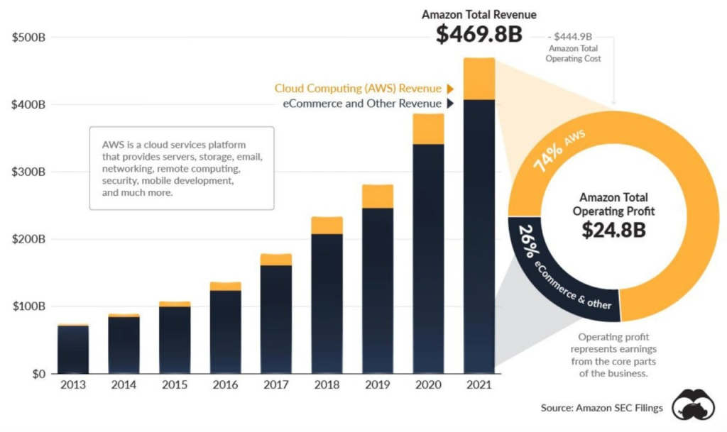 Опытные инвесторы понимают, что это не всегда очевидные вопросы, даже для крупных и известных бизнесов. Например, в 2021 году Amazon более 80% выручки получал от e-commerce, но 74% прибыли приносили облачные сервисы.