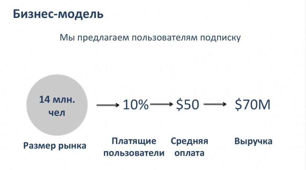 Иногда можно одним слайдом объяснить и бизнес-модель, и размер выручки, на которую претендует компания.