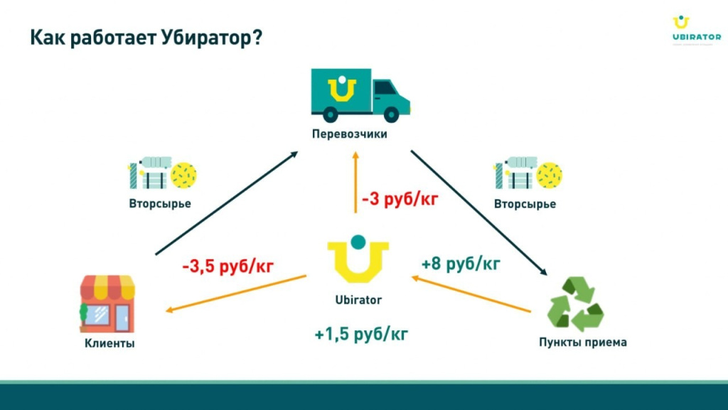 Слайд компании Убиратор. В целом для бизнес-модели нормально. Особенно если это картинка для выступления. Команде сложно объяснить модель одним словом, и приходится усложнять. Поэтому оправдано, что нет других цифр и вводных.