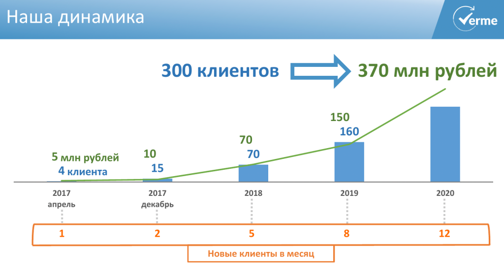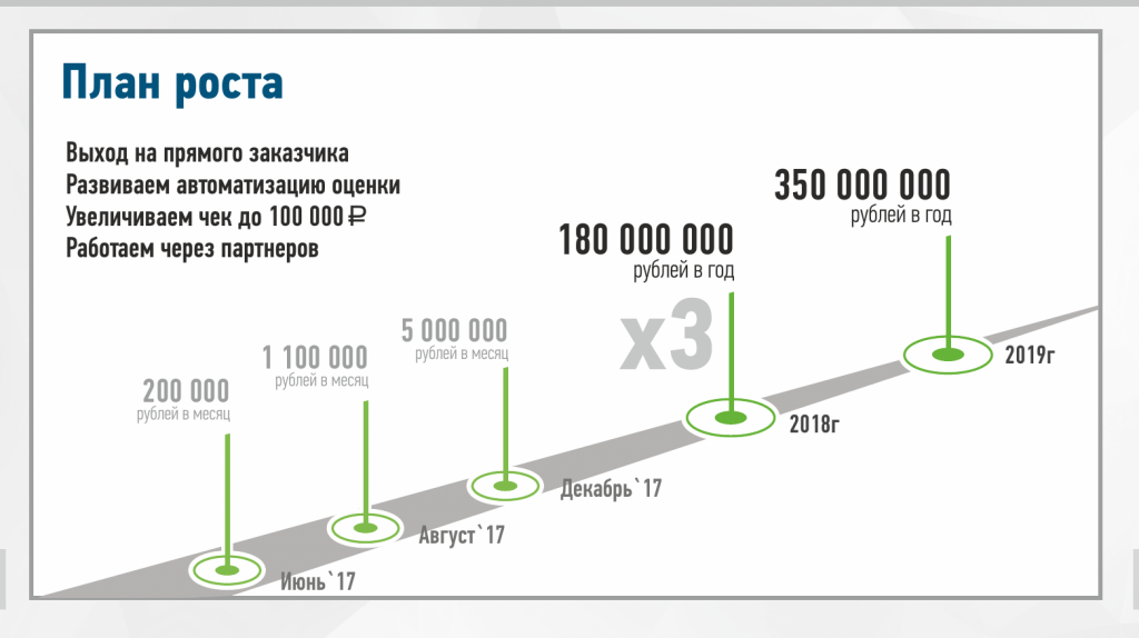 Отличный слайд для подтверждения, что команда умеет расти быстро. Особенно если учесть, что результат сделан за три месяца. Но совершенно непонятно, на сколько компания сможет вырасти через 3–5 лет.