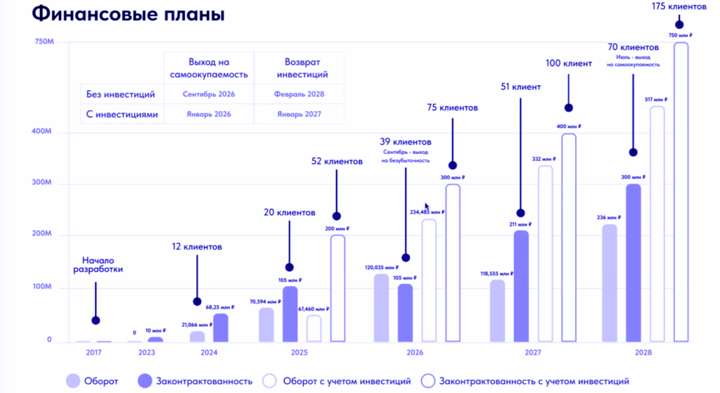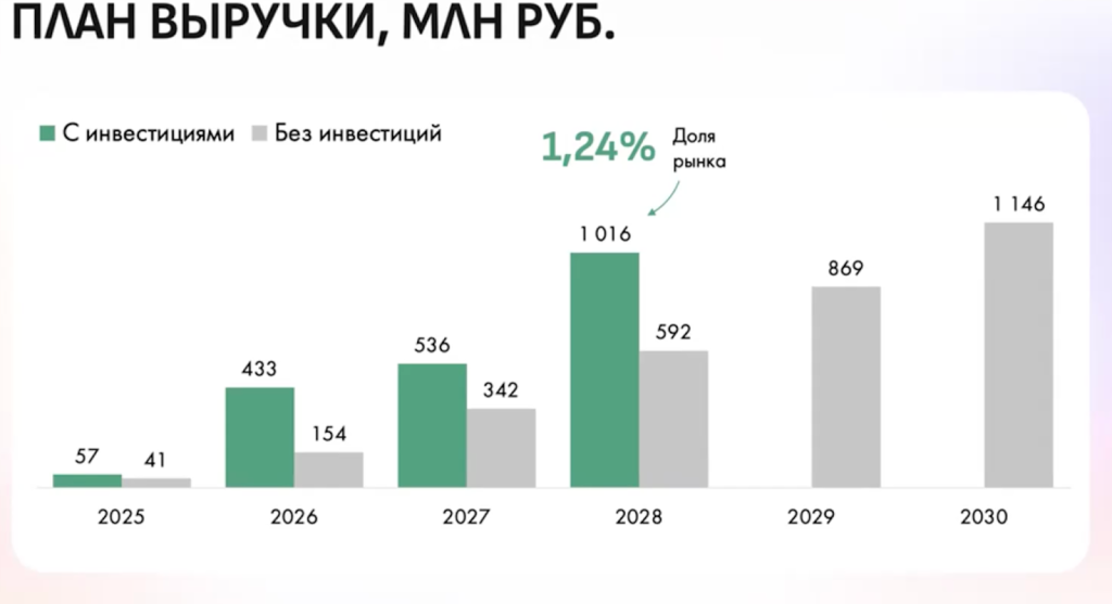 Здесь уже есть детали: сколько клиентов нужно, сколько клиентов будет прибывать в месяц и какую выручку получит компания. Прибыльный это бизнес или убыточный — не очевидно. 370 миллионов рублей — не предел мечтаний инвестора, и хотелось бы видеть прогноз, как и когда компания планирует дойти до 1 млрд рублей.