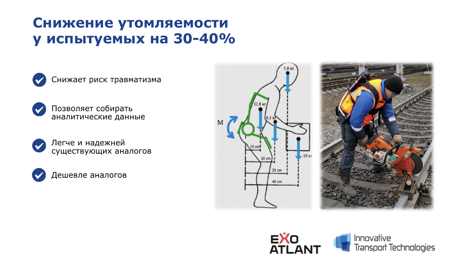 Начнём со слайда о физическом продукте компании Экзоатлант. Сразу понятно, как выглядит и какую проблему решает продукт. Ещё один плюс — команда указала эффект от использования продукта. Из слайда становится понятно, как жизнь рабочих изменится в лучшую сторону. Но не совсем очевидно прописана уникальность продукта.