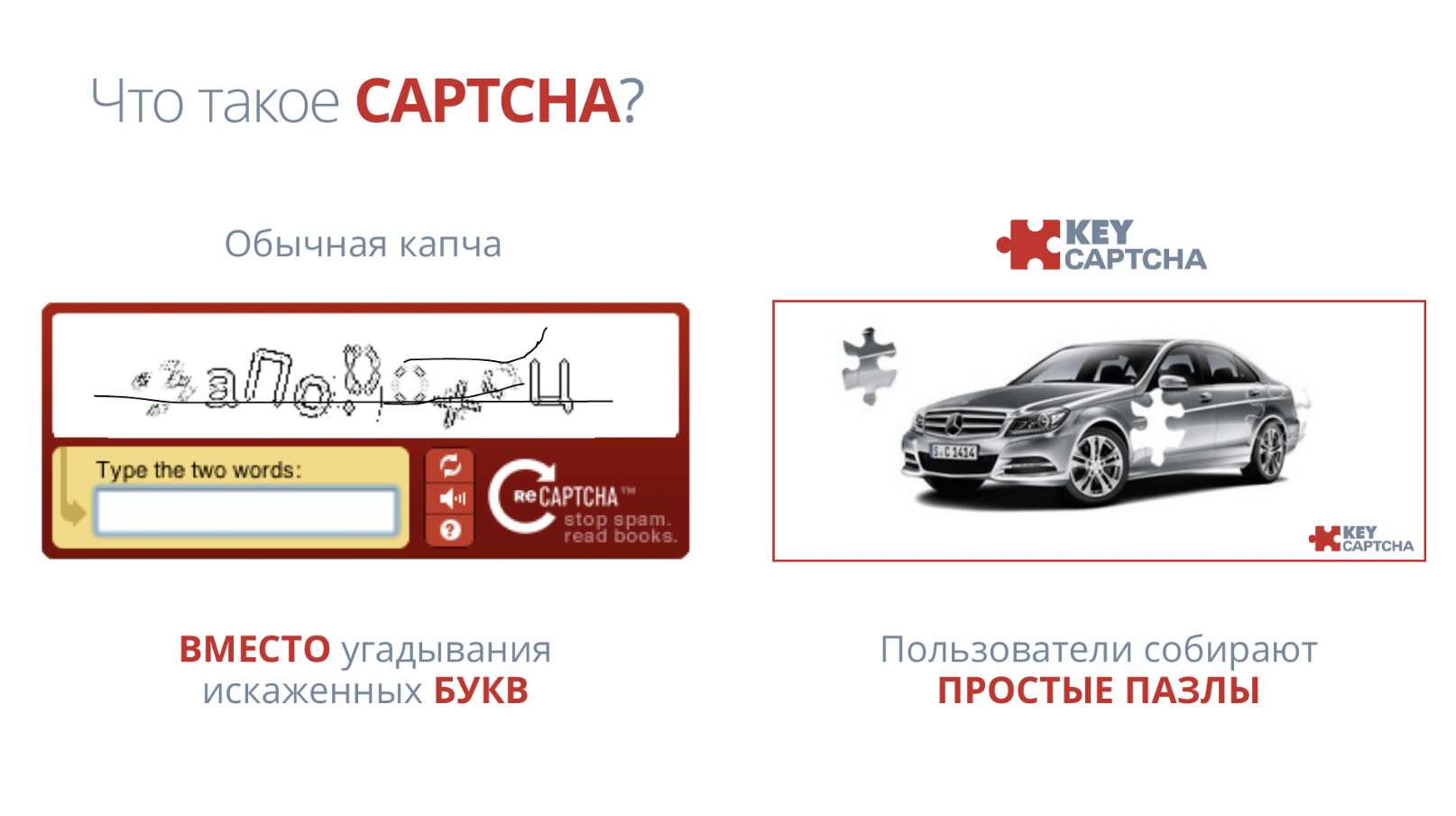 История показала, что продукт легко копируется. Более того, многие сервисы продолжают ставить неудобную для пользователей капчу, видимо, руководствуясь принципом «проблемы индейцев шерифа не волнуют». И клиенты вынуждены пробиваться механизм защиты и доказывать, что они не роботы. Однако пример слайда хороший.